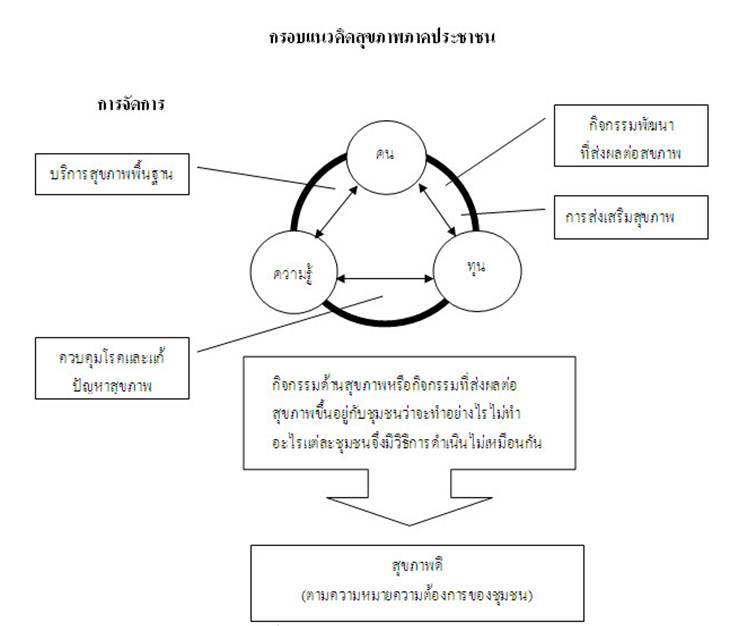 องค์ประกอบทั้ง 3 ประการนี้ จะไม่เกิดประโยชน์อันใดเลยหากขาดการจัดการที่เป็นระบบ และมีความสมดุล ซึ่งการจัดการในที่นี้คือ การปฏิบัติเพื่อการประสานให้มีการเคลื่อนไหวขององค์ประกอบทั้ง 3 ประการ และให้เกิดการดำเนินกิจกรรมการพัฒนาสุขภาพ เพื่อสนองความต้องการของคนในชุมชน ทำให้คนในชุมชนมีสุขภาพดีถ้วนหน้า ดังกรอบแนวคิดสุขภาพภาคประชาชนต่อไปนี้